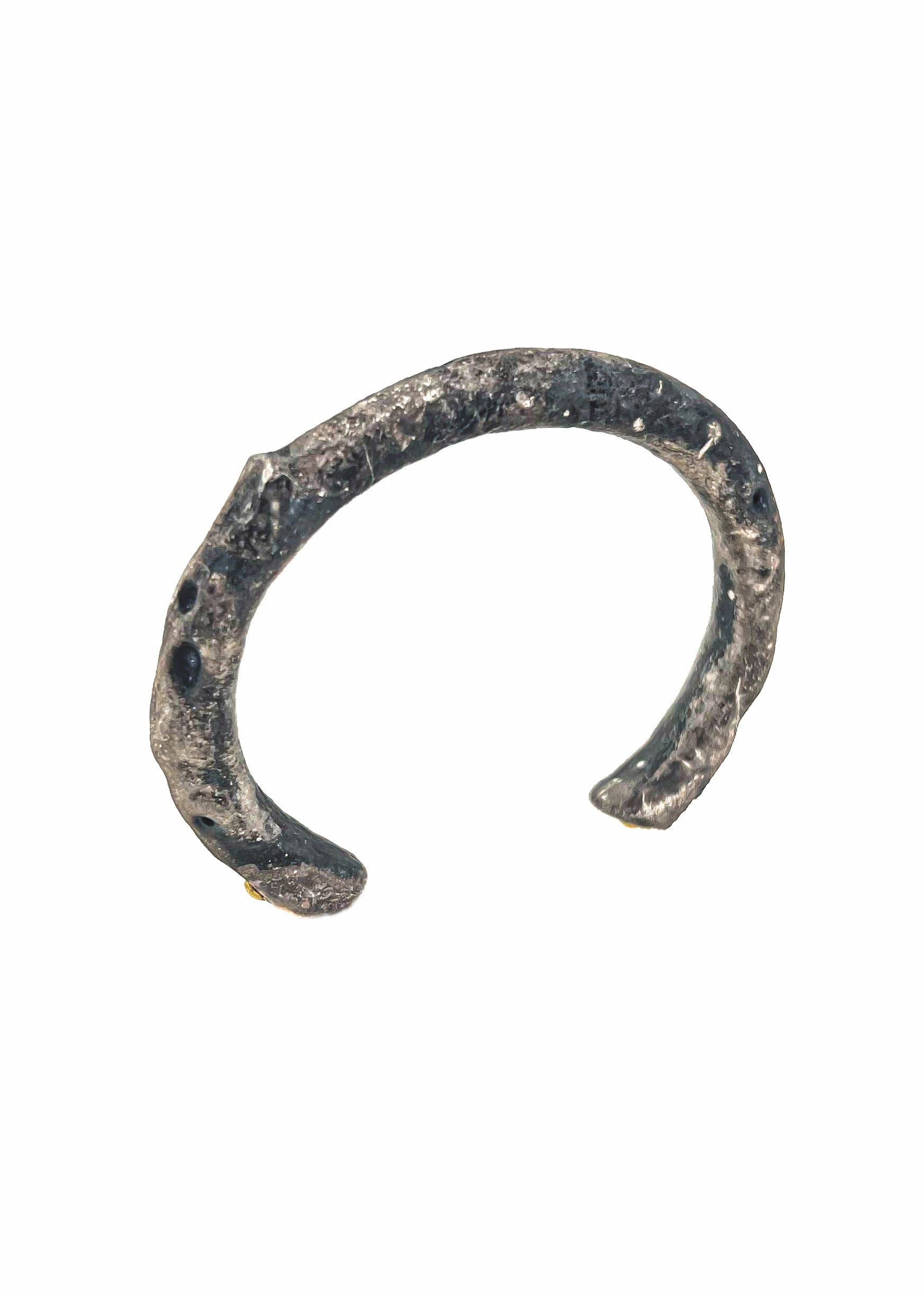 The Bone Bangle S is created using 925 recycled sterling silver and 18ct recycled yellow gold, with approximate dimensions of W: 64mm x H: 50mm x D: 9mm. The inner width is about 50mm, and an opening of 22-24mm allows for easy yet secure wearing.