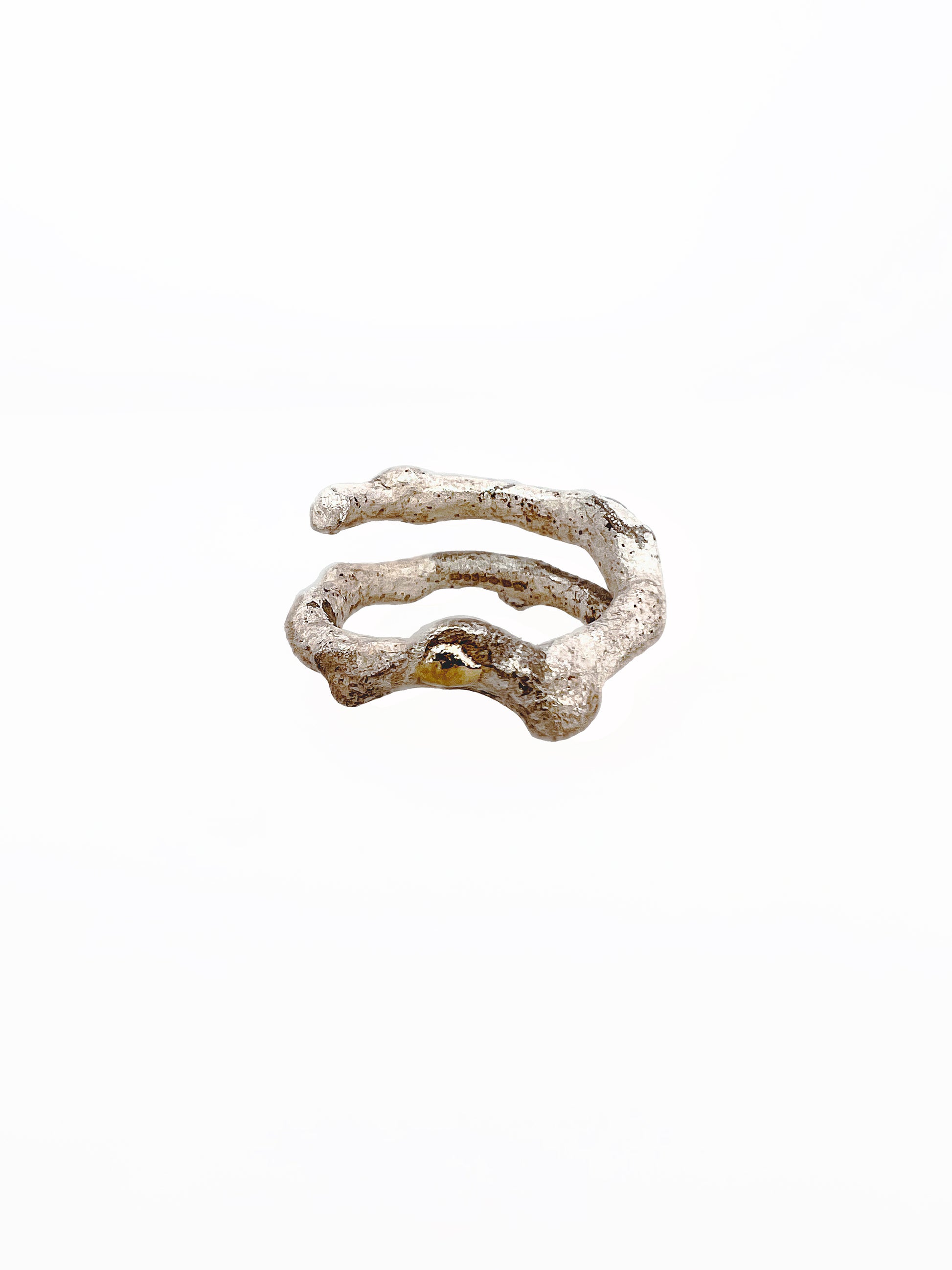 Each Bone ring No.4 (Long) is individually crafted with recycled 925 sterling silver and features fused solid 9ct gold (hallmarked). As a result of the handmade processes, each piece has a unique weight, measurement, and finish.