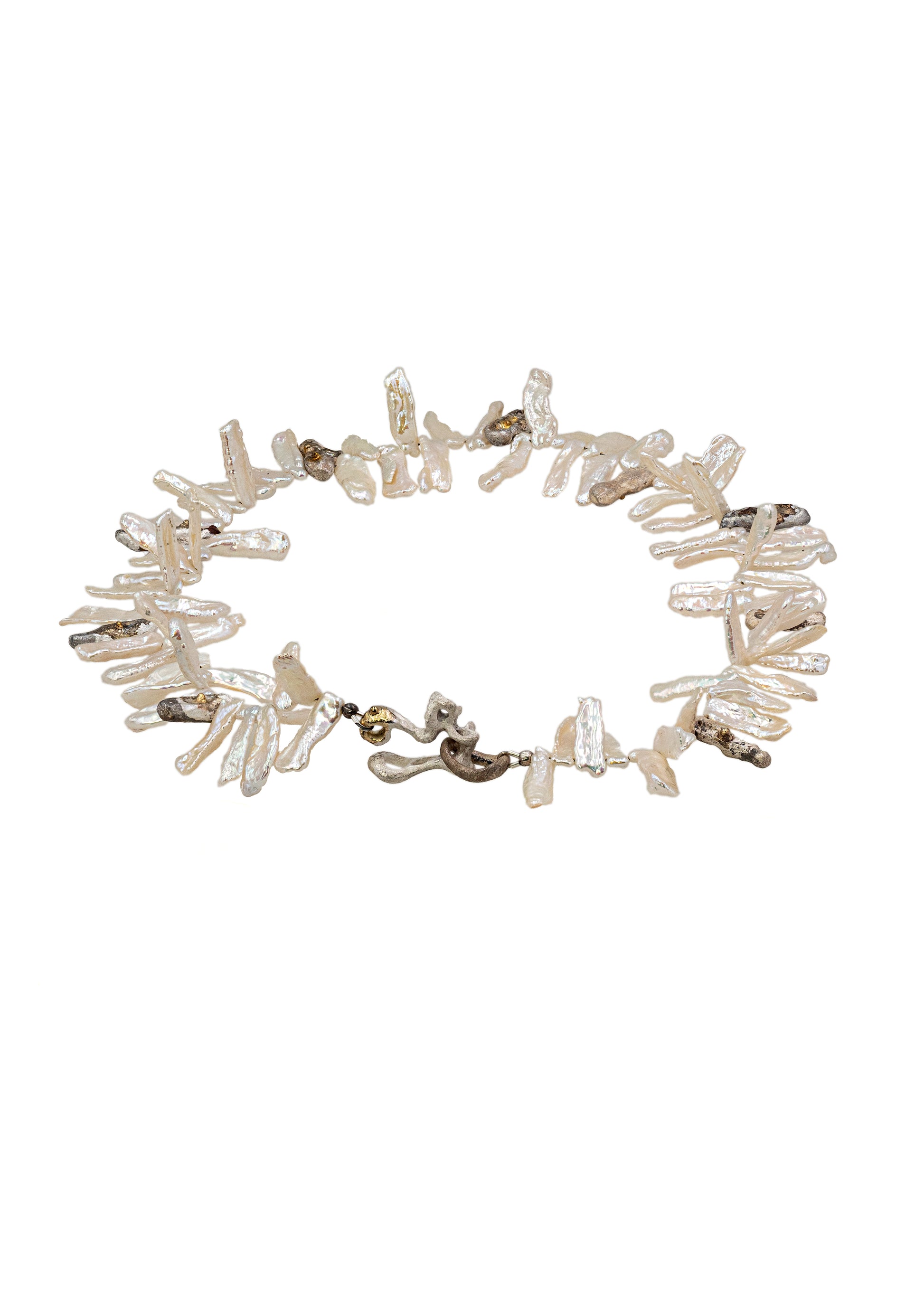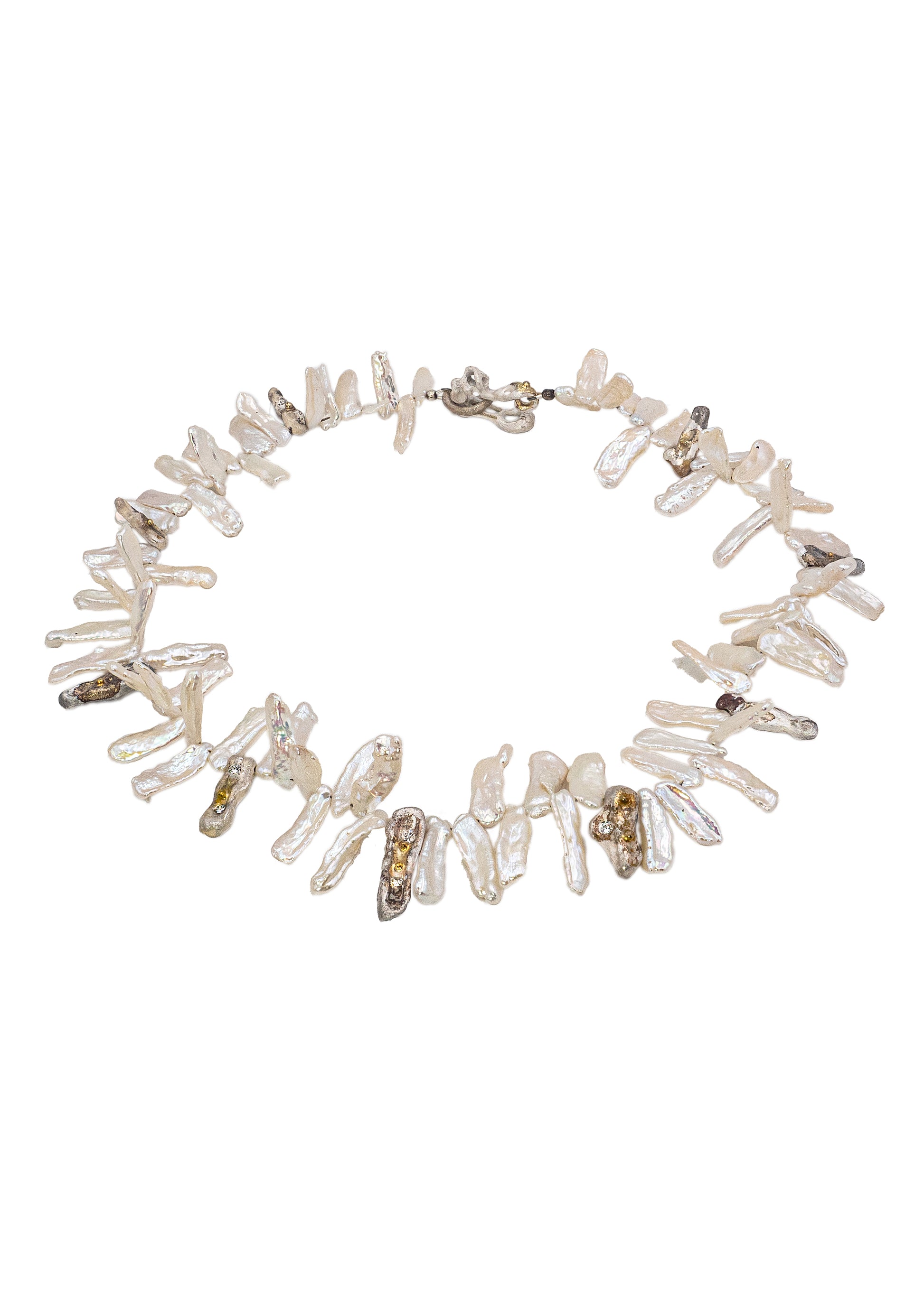 Ocean Beast Necklace with S size Biwa Pearls, diamonds, Silver and gold “Oyster“ beads